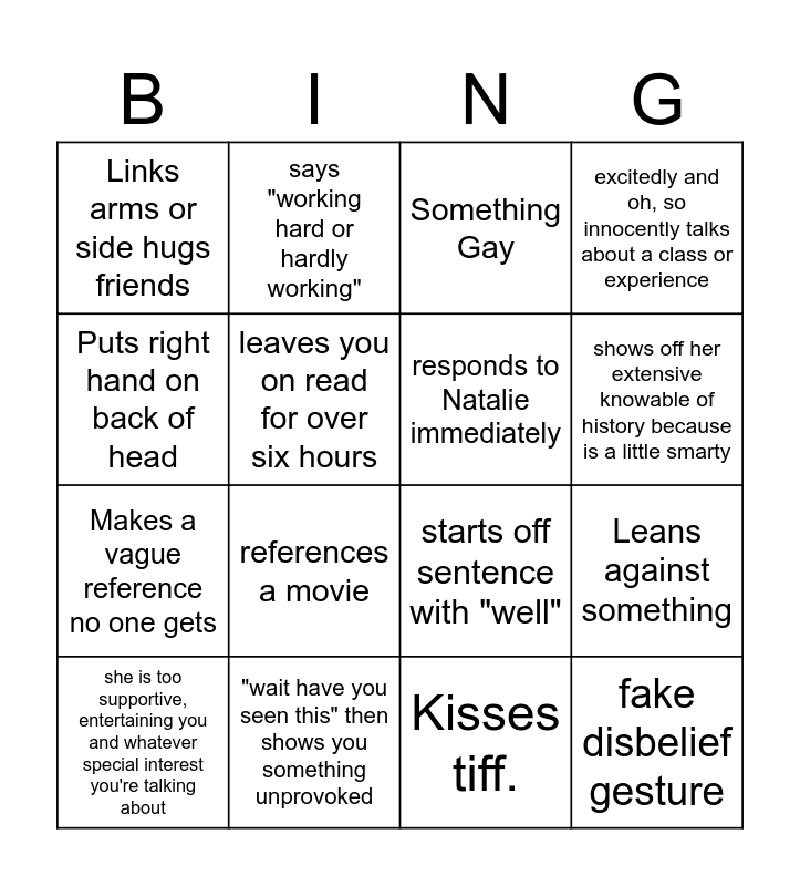 This bingo card has 19 words: starts off sentence with "well", "That's what she said!", Something Gay, fake disbelief gesture, Leans against something, Puts right hand on back of head, Kisses tiff., Links arms or side hugs friends, says "working hard or hardly working", Makes a vague reference no one gets, references a movie, leaves you on read for over six hours, responds to Natalie immediately, "wait have you seen this" then shows you something unprovoked, she is too supportive, entertaining you and whatever special interest you're talking about, says "everyone and their mom", excitedly and oh, so innocently talks about a class or experience, shows off her extensive knowable of history because is a little smarty and "woof".
