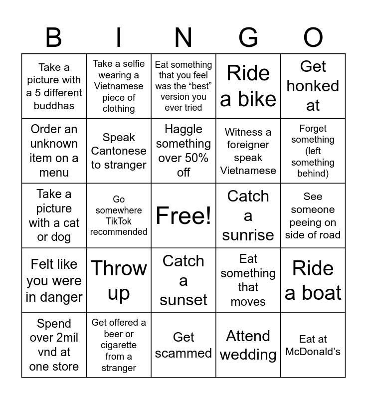 This bingo card has a free space and 25 words: Throw up, Get scammed, Haggle something over 50% off, Spend over 2mil vnd at one store, Get honked at, Take a picture with a 5 different buddhas, Order an unknown item on a menu, Take a selfie wearing a Vietnamese piece of clothing, Catch a sunrise, Catch a sunset, Witness a foreigner speak Vietnamese, Take a picture with a cat or dog, Eat something that moves, Ride a boat, Speak Cantonese to stranger, Eat at a Michelin star place, See someone peeing on side of road, Eat something that you feel was the “best” version you ever tried, Forget something (left something behind), Go somewhere TikTok recommended, Eat at McDonald’s, Get offered a beer or cigarette from a stranger, Felt like you were in danger, Ride a bike and Attend wedding.