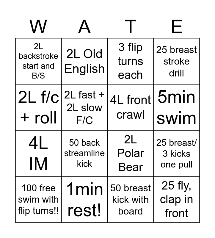 This bingo card has 25 words: 4L breaststroke, 2L scull, 5min swim, 2L underwater, 2L f/c + roll, 2L backstroke start and B/S, 2L fast + 2L slow F/C, 2L Old English, 1min rest!, 2L horse noodle, 4L IM, 2L Polar Bear, 2L Fly, 2L you decide!, 4L front crawl, 2L streamline kick, 50 breast kick with board, 3 flip turns each, 50 back streamline kick, 25 breast/ 3 kicks one pull, 100 free swim with flip turns!!, 50 choice kick, H/E, 25 fly, clap in front, 25 breast stroke drill and 100 choice swim.