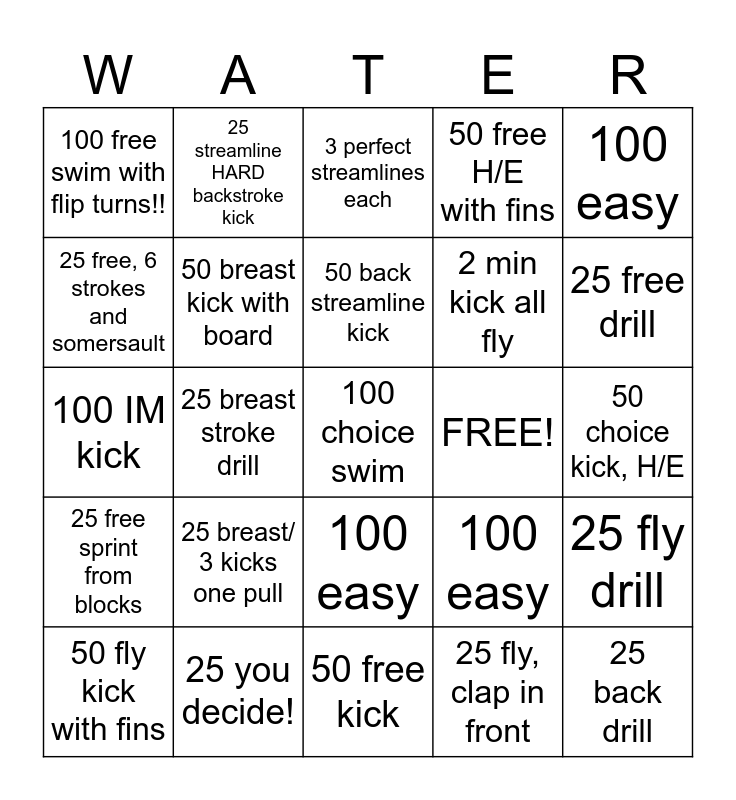 This bingo card has 27 words: 100 easy, 25 back drill, 2 min kick all fly, 50 free kick, 25 free, 6 strokes and somersault, 3 perfect streamlines each, 25 streamline HARD backstroke kick, 25 free sprint from blocks, FREE!, 25 fly drill, 100 IM kick, 50 free H/E with fins, 50 fly kick with fins, 25 you decide!, 25 free drill, 50 fly streamline kick, 50 breast kick with board, 50 back streamline kick, 25 breast/ 3 kicks one pull, 100 free swim with flip turns!!, 50 choice kick, H/E, 25 fly, clap in front, 25 breast stroke drill, 100 choice swim, 100 easy, 100 easy and 100 easy.