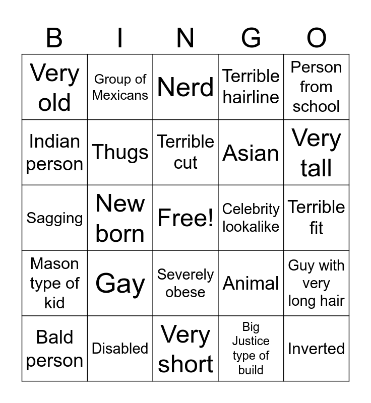 This bingo card has a free space and 24 words: Gay, Disabled, Terrible cut, Bald person, Person from school, Very old, Indian person, Group of Mexicans, Celebrity lookalike, Severely obese, Asian, Sagging, Animal, Guy with very long hair, Thugs, Big Justice type of build, Terrible fit, Nerd, Very tall, New born, Inverted, Mason type of kid, Terrible hairline and Very short.