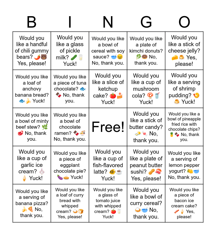 This bingo card has a free space and 33 words: Would you like a slice of natto cookies? 🤢🍪 Yuck!, Would you like a loaf of squid ink bread? 🦑🍞 Yes, please!, Would you like a bowl of chocolate ramen? 🍫🍜 No, thank you., Would you like a plate of mayonnaise pancakes? 🥞🥴 Yuck!, Would you like a cup of garlic ice cream? 🧄🍦 Yuck!, Would you like a piece of tuna chocolate? 🐟🍫 No, thank you., Would you like a stick of cheese jelly? 🧀🍮 Yes, please!, Would you like a serving of banana pizza? 🍌🍕 No, thank you., Would you like a glass of pickle milk? 🥒🥛 Yuck!, Would you like a handful of wasabi marshmallows? 🌶️🍡 Yes, please!, Would you like a slice of ketchup cake? 🍅🍰 Yuck!, Would you like a bowl of cereal with soy sauce? 🥣😖 No, thank you., Would you like a plate of blueberry spaghetti? 🫐🍝 Yes, please!, Would you like a cup of onion soda? 🧅🥤 Yuck!, Would you like a stick of butter candy? 🧈🍬 No, thank you., Would you like a serving of shrimp pudding? 🍤🍮 Yuck!, Would you like a loaf of curry bread with whipped cream? 🍛🍞 Yes, please!, Would you like a bowl of minty beef stew? 🌿🥩 No, thank you., Would you like a piece of eggplant chocolate pie? 🍆🥧 Yuck!, Would you like a plate of peanut butter sushi? 🥜🍣 Yes, please!, Would you like a cup of fish-flavored latte? 🐠☕ Yuck!, Would you like a slice of mustard cheesecake? 🌭🍰 No, thank you., Would you like a handful of chili gummy bears? 🌶️🐻 Yes, please!, Would you like a bowl of pineapple fried rice with chocolate chips? 🍍🍫 No, thank you., Would you like a glass of tomato juice with whipped cream? 🍅🥛 Yuck!, Would you like a piece of bacon ice cream cake? 🥓🍦 Yes, please!, Would you like a plate of kimchi donuts? 🥬🍩 No, thank you., Would you like a cup of mushroom cola? 🍄🥤 Yuck!, Would you like a loaf of anchovy banana bread? 🐟🍌 Yuck!, Would you like a serving of lemon pepper yogurt? 🍋🥣 No, thank you., Would you like a slice of avocado jelly pie? 🥑🥧 Yes, please!, Would you like a bowl of curry cereal? 🍛🥣 No, thank you. and Would you like a stick of licorice tofu? 🍬🧊 Yuck!.