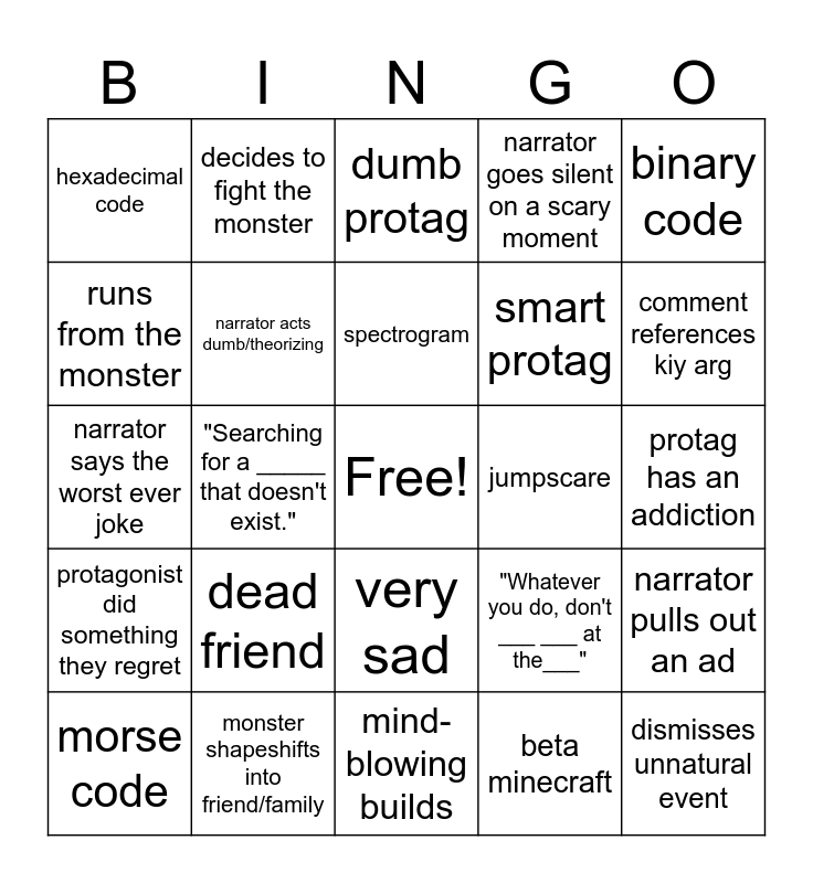 This bingo card has a free space and 24 words: dead friend, monster shapeshifts into friend/family, spectrogram, morse code, binary code, hexadecimal code, runs from the monster, decides to fight the monster, jumpscare, very sad, smart protag, narrator says the worst ever joke, "Whatever you do, don't ___ ___ at the___", narrator pulls out an ad, narrator acts dumb/theorizing, beta minecraft, protag has an addiction, dumb protag, comment references kiy arg, "Searching for a _____ that doesn't exist.", dismisses unnatural event, protagonist did something they regret, narrator goes silent on a scary moment and mind-blowing builds.