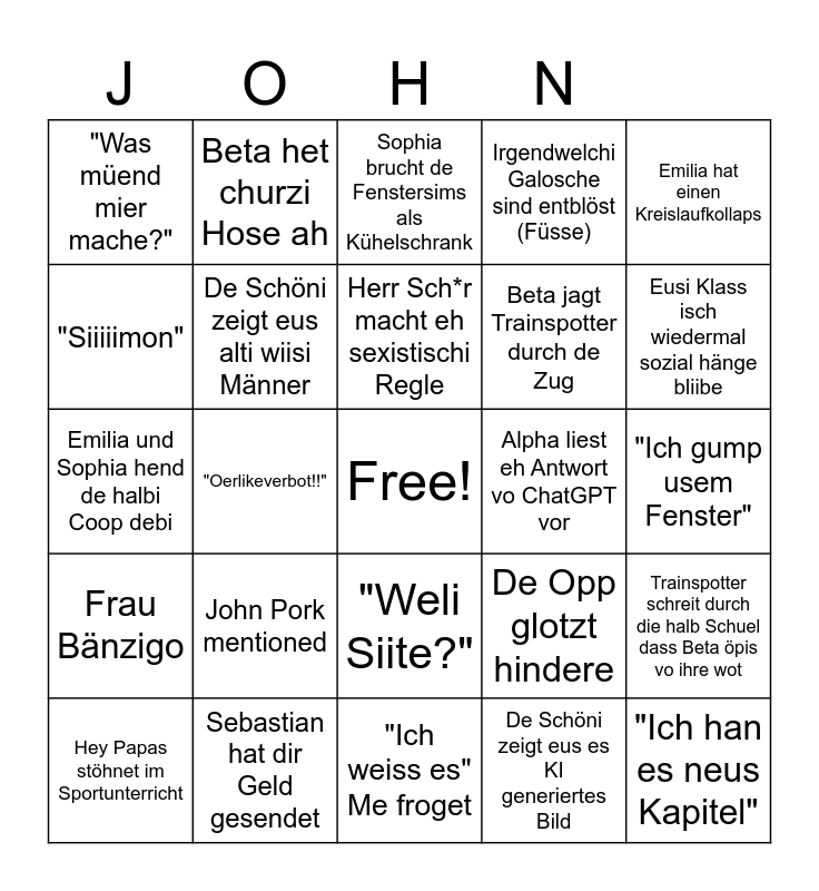 This bingo card has a free space and 24 words: John Pork mentioned, Sebastian hat dir Geld gesendet, Herr Sch*r macht eh sexistischi Regle, Hey Papas stöhnet im Sportunterricht, Emilia hat einen Kreislaufkollaps, "Was müend mier mache?", "Siiiiimon", Beta het churzi Hose ah, Alpha liest eh Antwort vo ChatGPT vor, "Weli Siite?", Beta jagt Trainspotter durch de Zug, Emilia und Sophia hend de halbi Coop debi, De Opp glotzt hindere, Trainspotter schreit durch die halb Schuel dass Beta öpis vo ihre wot, De Schöni zeigt eus alti wiisi Männer, De Schöni zeigt eus es KI generiertes Bild, "Ich gump usem Fenster", Sophia brucht de Fenstersims als Kühelschrank, Eusi Klass isch wiedermal sozial hänge bliibe, "Oerlikeverbot!!", "Ich han es neus Kapitel", Frau Bänzigo, Irgendwelchi Galosche sind entblöst (Füsse) and "Ich weiss es" Me froget.