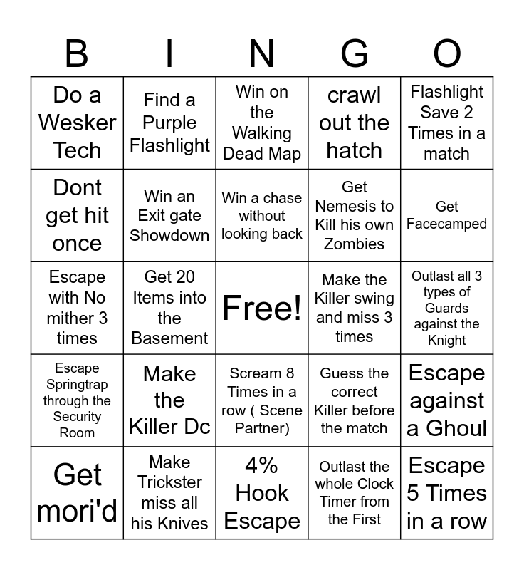 This bingo card has a free space and 49 words: Loop The Killer for 5 Gens, Escape 5 Times in a row, 0 Perks Escape, 4% Hook Escape, Make the Killer Dc, Stun the Huntress 5 times in a match, Find a Purple Flashlight, 6 Hyperfocus Stacks, Dont get hit once, Choose 3 Killers When you face them you need to escape, Win an Exit gate Showdown, crawl out the hatch, Escape against a Ghoul, Guess the correct Killer before the match, Killer blames you in EGC, Teammates blame you in EGC, Win a chase without looking back, Make the Killer swing and miss 3 times, Locker Fake, Flashlight Save 2 Times in a match, Get 20 Items into the Basement, Outlast the whole Clock Timer from the First, Do a Wesker Tech, Get Nemesis to Kill his own Zombies, Make a Trapper step in his own Trap twice, Get Facecamped, Get mori'd, Escape while having an active headTrap, Scream 8 Times in a row ( Scene Partner), Escape Springtrap through the Security Room, Kick Victor 5 Times in one match, Unlock the Nostromo secret Room, Guess all Killer Perks and Survivor Perks in one match, Face at least 3 Legendary Cosmetics (Survivor and Killer), Make Trickster miss all his Knives, Help a Teammate wiggle off a Killers back twice, Have both artifacts against the Lich, Face a Hag and make her swing 3 times, Outlast all 3 types of Guards against the Knight, Stun a Plague while she has corrupt Purge, Reveal Ghost Face 5 Times, Never get chainsawed by Billy or Leatherface, Get Compliments on your Steam Profile or EGC from Randoms, Do all 5 Gens and Escape, Escape with No mither 3 times, Win on the Walking Dead Map, Outlast a Oni with Fury Attack, Make a Dracula switch Forms 20 Times in one Chase and Have 0 Condemn at the end of the Match against Onryo.