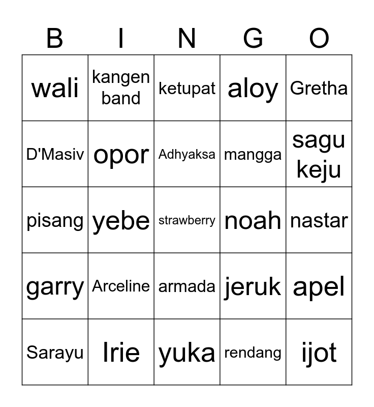 This bingo card has a free space and 24 words: Arceline, Irie, Adhyaksa, Sarayu, Gretha, wali, D'Masiv, kangen band, noah, armada, mangga, pisang, jeruk, apel, opor, rendang, nastar, ketupat, sagu keju, yebe, ijot, garry, aloy and yuka.