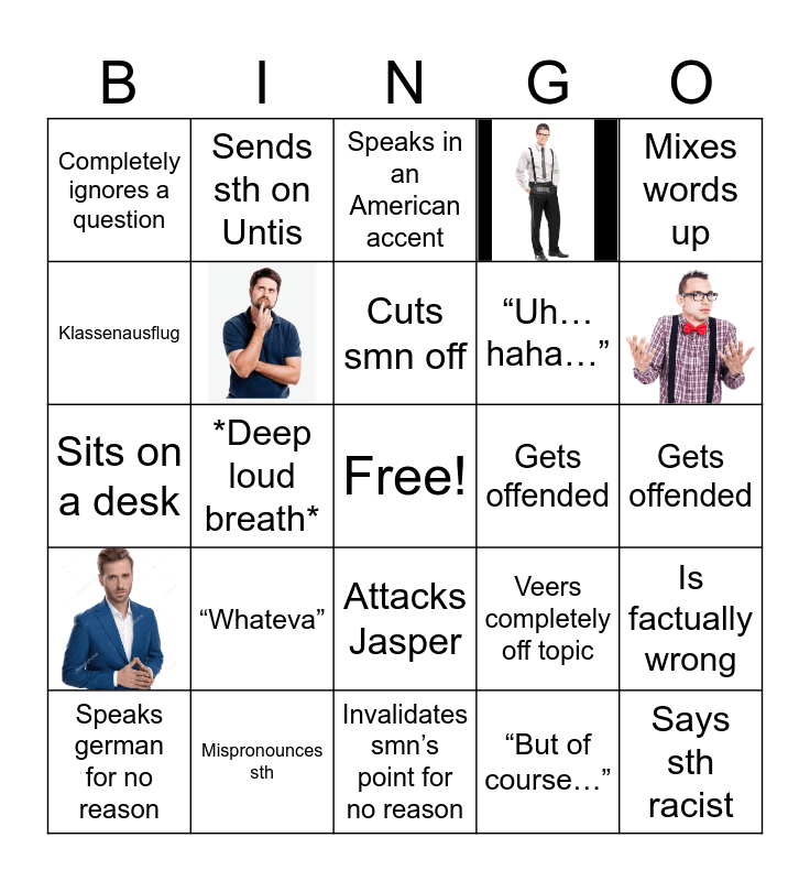 This bingo card has 4 images, a free space and 20 words: “Whateva”, Mispronounces sth, Cuts smn off, Speaks german for no reason, Mixes words up, Completely ignores a question, Klassenausflug, Sends sth on Untis, Gets offended, Attacks Jasper, “Uh… haha…”, Sits on a desk, Veers completely off topic, Is factually wrong, “But of course…”, Gets offended, Speaks in an American accent, *Deep loud breath*, Says sth racist and Invalidates smn’s point for no reason.