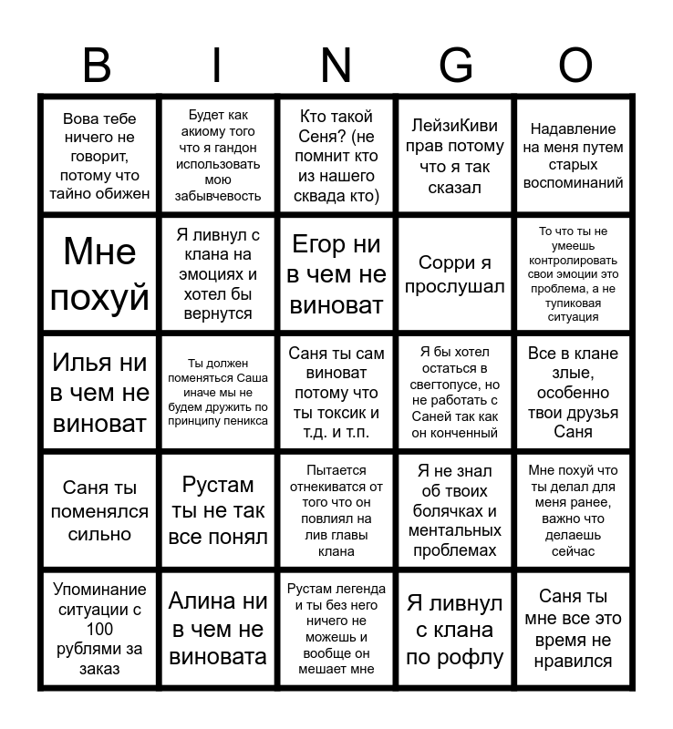 This bingo card has a free space and 24 words: Рустам ты не так все понял, Алина ни в чем не виновата, Егор ни в чем не виноват, Упоминание ситуации с 100 рублями за заказ, Надавление на меня путем старых воспоминаний, Вова тебе ничего не говорит, потому что тайно обижен, Мне похуй, Будет как акиому того что я гандон использовать мою забывчевость, Я бы хотел остаться в свегтопусе, но не работать с Саней так как он конченный, Пытается отнекиватся от того что он повлиял на лив главы клана, Сорри я прослушал, Илья ни в чем не виноват, Я не знал об твоих болячках и ментальных проблемах, Мне похуй что ты делал для меня ранее, важно что делаешь сейчас, Я ливнул с клана на эмоциях и хотел бы вернутся, Я ливнул с клана по рофлу, Все в клане злые, особенно твои друзья Саня, Кто такой Сеня? (не помнит кто из нашего сквада кто), То что ты не умеешь контролировать свои эмоции это проблема, а не тупиковая ситуация, Ты должен поменяться Саша иначе мы не будем дружить по принципу пеникса, Саня ты мне все это время не нравился, Саня ты поменялся сильно, ЛейзиКиви прав потому что я так сказал and Рустам легенда и ты без него ничего не можешь и вообще он мешает мне.