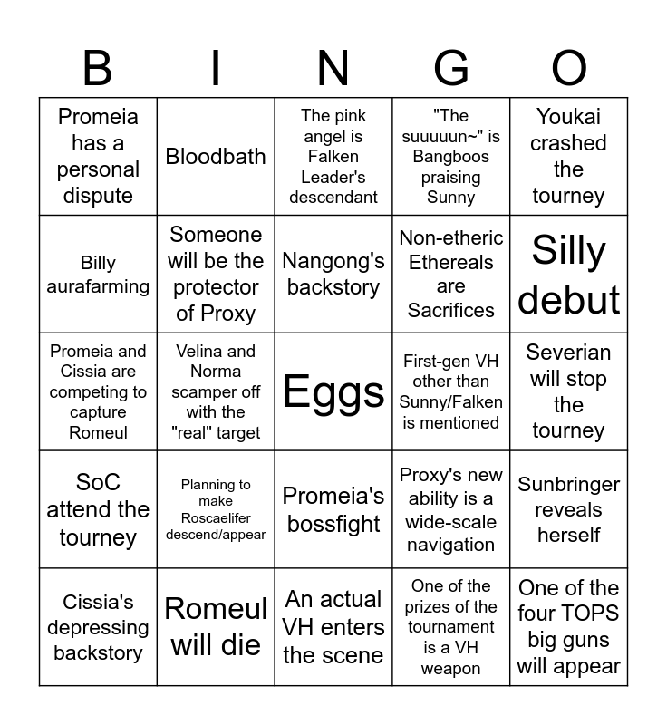 This bingo card has a free space and 24 words: Planning to make Roscaelifer descend/appear, Romeul will die, Nangong's backstory, Cissia's depressing backstory, Youkai crashed the tourney, Promeia has a personal dispute, Billy aurafarming, Bloodbath, First-gen VH other than Sunny/Falken is mentioned, Promeia's bossfight, Non-etheric Ethereals are Sacrifices, Promeia and Cissia are competing to capture Romeul, Proxy's new ability is a wide-scale navigation, Sunbringer reveals herself, Someone will be the protector of Proxy, One of the prizes of the tournament is a VH weapon, Severian will stop the tourney, The pink angel is Falken Leader's descendant, Silly debut, Velina and Norma scamper off with the "real" target, One of the four TOPS big guns will appear, SoC attend the tourney, "The suuuuun~" is Bangboos praising Sunny and An actual VH enters the scene.