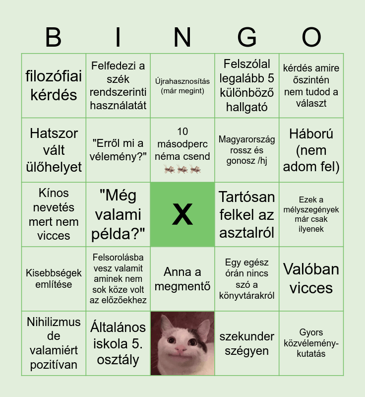 This bingo card has 1 images, a free space and 27 words: *a* pali mond valami hülyeséget, Általános iskola 5. osztály, 10 másodperc néma csend 🦗🦗🦗, szekunder szégyen, kérdés amire őszintén nem tudod a választ, filozófiai kérdés, "Erről mi a vélemény?", Tartósan felkel az asztalról, Valóban vicces, Kínos nevetés mert nem vicces, "Még valami példa?", Egy egész órán nincs szó a könyvtárakról, Gyors közvélemény-kutatás, Hatszor vált ülőhelyet, *a* pali fanfictiont olvas, Anna a megmentő, Felszólal legalább 5 különböző hallgató, Háború (nem adom fel), Nihilizmus de valamiért pozitívan, Felfedezi a szék rendszerinti használatát, Egy személy megnevezése név szerint, Magyarország rossz és gonosz /hj, Ezek a mélyszegények már csak ilyenek, Kisebbségek említése, Felsorolásba vesz valamit aminek nem sok köze volt az előzőekhez, Újrahasznosítás (már megint) and Hajléktalan slander *a* palitól.