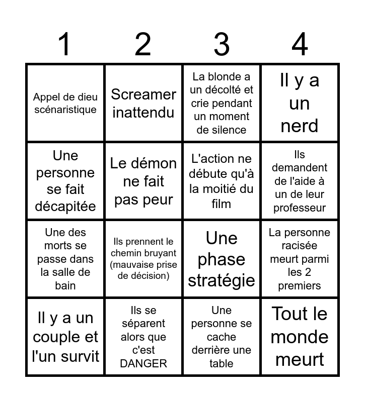This bingo card has 16 words: Ils se séparent alors que c'est DANGER, La personne racisée meurt parmi les 2 premiers, La blonde a un décolté et crie pendant un moment de silence, Appel de dieu scénaristique, Une des morts se passe dans la salle de bain, Screamer inattendu, Une phase stratégie, Une personne se cache derrière une table, Une personne se fait décapitée, Le démon ne fait pas peur, Il y a un couple et l'un survit, Il y a un nerd, Ils prennent le chemin bruyant (mauvaise prise de décision), Ils demandent de l'aide à un de leur professeur, L'action ne débute qu'à la moitié du film and Tout le monde meurt.