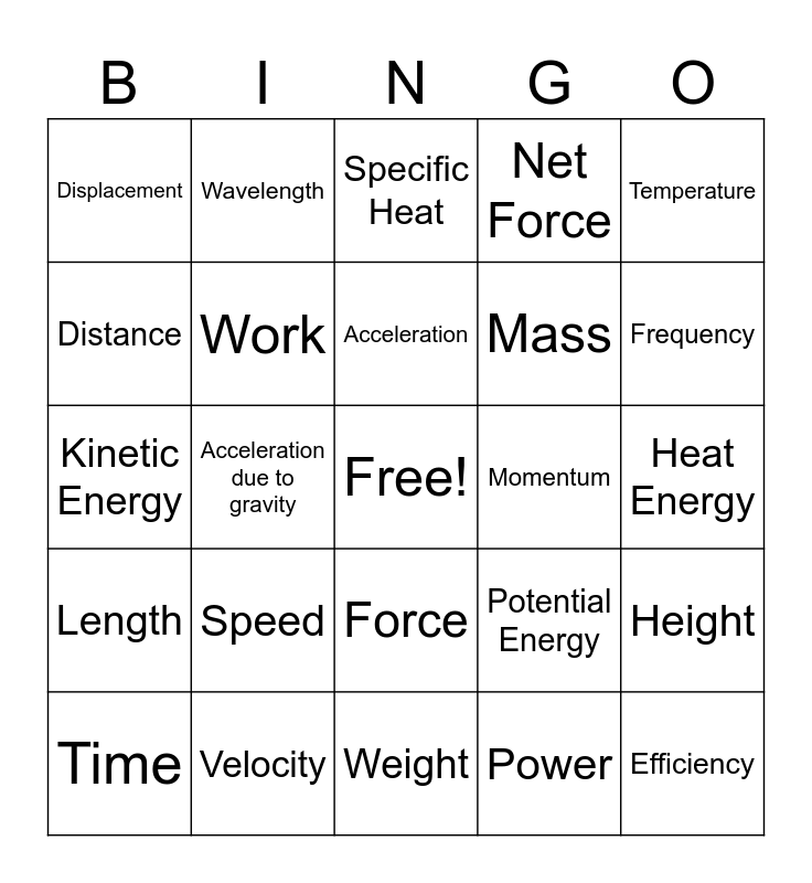 This bingo card has a free space and 24 words: Speed, Velocity, Acceleration, Time, Temperature, Displacement, Distance, Wavelength, Momentum, Force, Mass, Kinetic Energy, Potential Energy, Height, Work, Power, Heat Energy, Specific Heat, Frequency, Acceleration due to gravity, Efficiency, Length, Net Force and Weight.