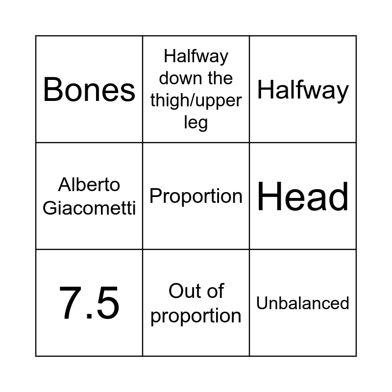 This bingo card has 17 words: Sculpture, Loneliness, Halfway, Bones, Joints, Alberto Giacometti, Secondary, 7.5, Out of proportion, Head, 2, Primary, Proportion, Halfway down the thigh/upper leg, Unbalanced, Tone and Having a strong, flat base.
