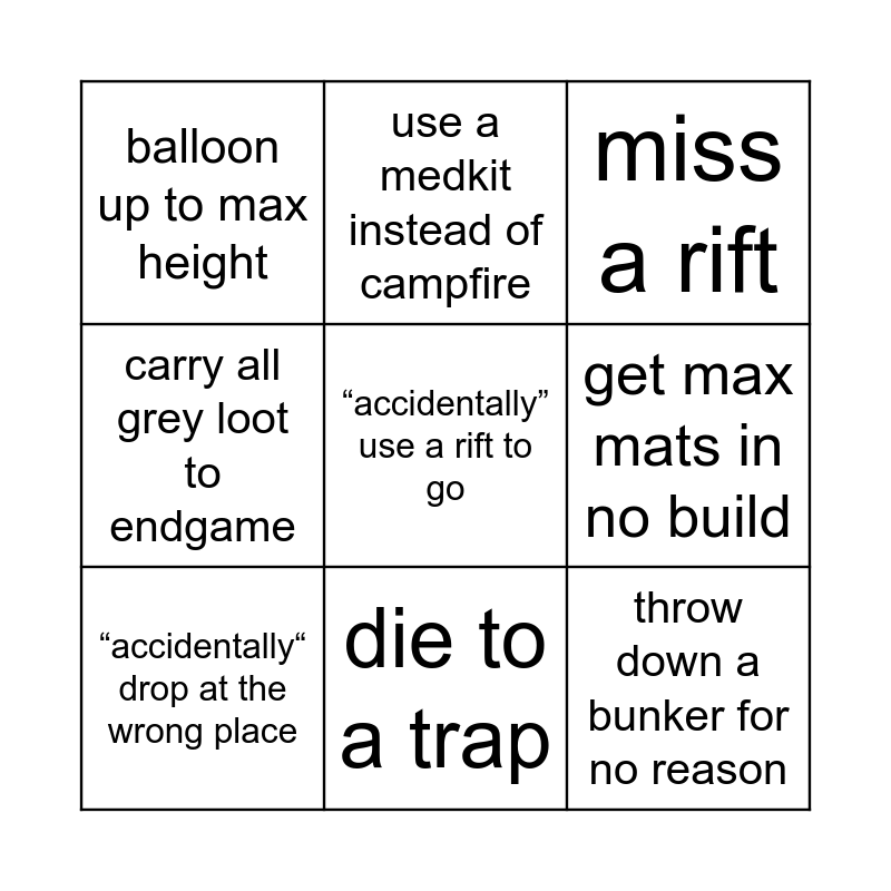 This bingo card has 9 words: “accidentally“ drop at the wrong place, miss a rift, use a medkit instead of campfire, carry all grey loot to endgame, balloon up to max height, get max mats in no build, “accidentally” use a rift to go, throw down a bunker for no reason and die to a trap.