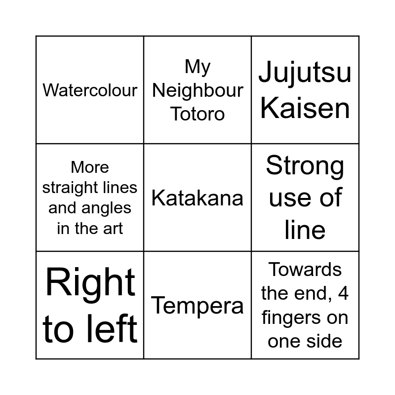 This bingo card has 12 words: Big eyes, Towards the end, 4 fingers on one side, Katakana, Strong use of line, My Neighbour Totoro, Jujutsu Kaisen, Tempera, Woodblock print, Watercolour, More straight lines and angles in the art, Right to left and A Japanese animator, filmmaker, and co-founder of Studio Ghibli.