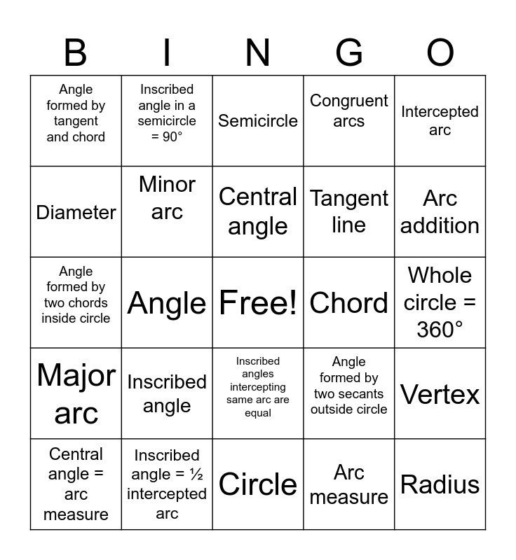 This bingo card has a free space and 24 words: Inscribed angle, Inscribed angle = ½ intercepted arc, Central angle, Central angle = arc measure, Intercepted arc, Angle formed by tangent and chord, Diameter, Inscribed angle in a semicircle = 90°, Chord, Inscribed angles intercepting same arc are equal, Tangent line, Angle formed by two chords inside circle, Angle formed by two secants outside circle, Vertex, Minor arc, Arc measure, Whole circle = 360°, Semicircle, Arc addition, Angle, Radius, Major arc, Congruent arcs and Circle.