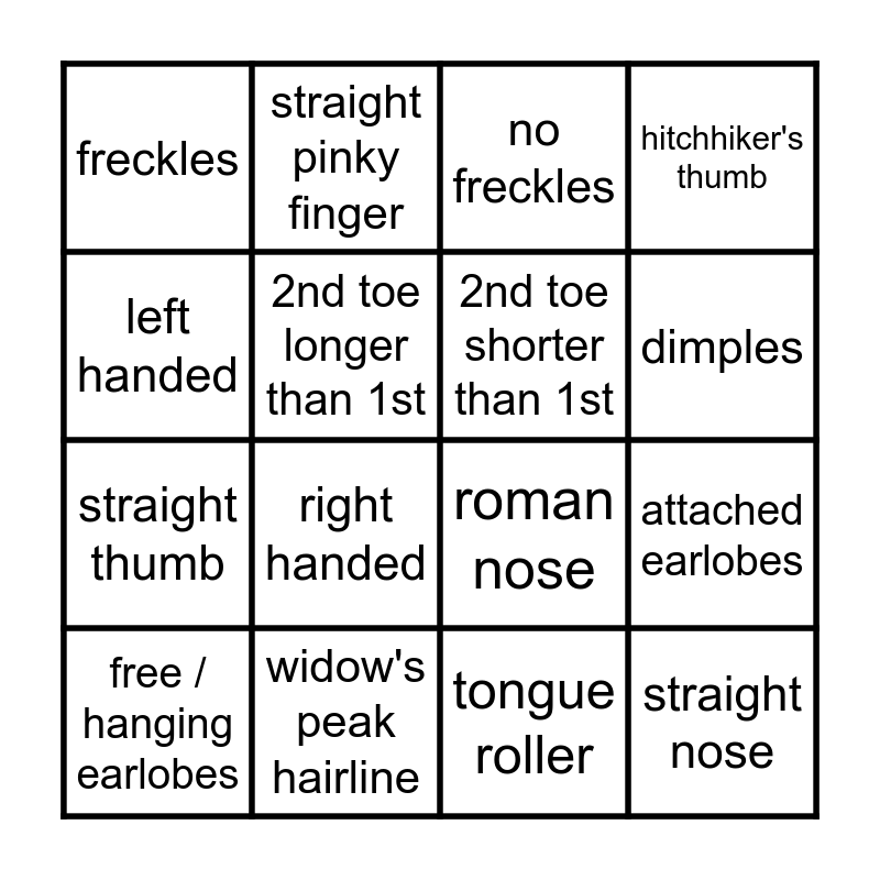 This bingo card has 22 words: widow's peak hairline, straight hairline, straight pinky finger, curved pinky finger, 2nd toe longer than 1st, 2nd toe shorter than 1st, freckles, no freckles, roman nose, straight nose, straight thumb, hitchhiker's thumb, cleft chin, no cleft chin, tongue roller, non-tongue roller, attached earlobes, free / hanging earlobes, right handed, left handed, dimples and no dimples.