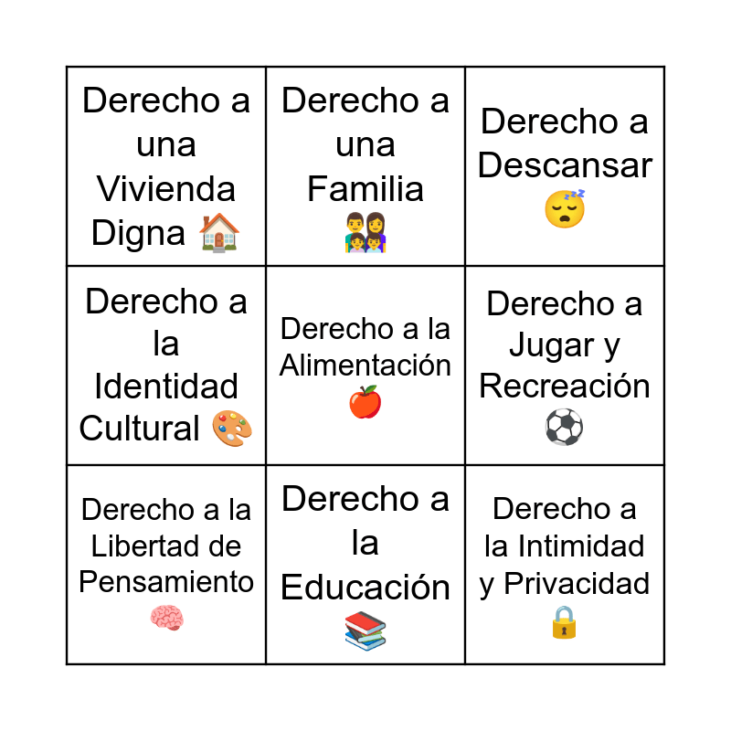 This bingo card has 23 words: Derecho a la Vida ❤️, Derecho a un Nombre y Nacionalidad 🪪, Derecho a la Educación 📚, Derecho a la Salud y Médicos 🩺, Derecho a la Alimentación 🍎, Derecho a una Vivienda Digna 🏠, Derecho a Jugar y Recreación ⚽, Derecho a una Familia 👨👩👧👦, Derecho a la No Discriminación 🌍, Derecho a la Libertad de Expresión 🗣️, Derecho a ser Protegido del Trabajo Infantil 🚫🛠️, Derecho a la Intimidad y Privacidad 🔒, Derecho a la Protección contra el Maltrato 🛡️, Derecho a la Información Adecuada 📺, Derecho de los Niños con Discapacidad ♿, Derecho al Amor y la Comprensión 🥰, Derecho a Descansar 😴, Derecho a ser Escuchado 👂, Derecho a la Libertad de Pensamiento 🧠, Derecho a una Vida sin Violencia 🕊️, Derecho a la Identidad Cultural 🎨, Derecho a Vivir en un Ambiente Sano 🌳 and Derecho a la Paz 🏳️.