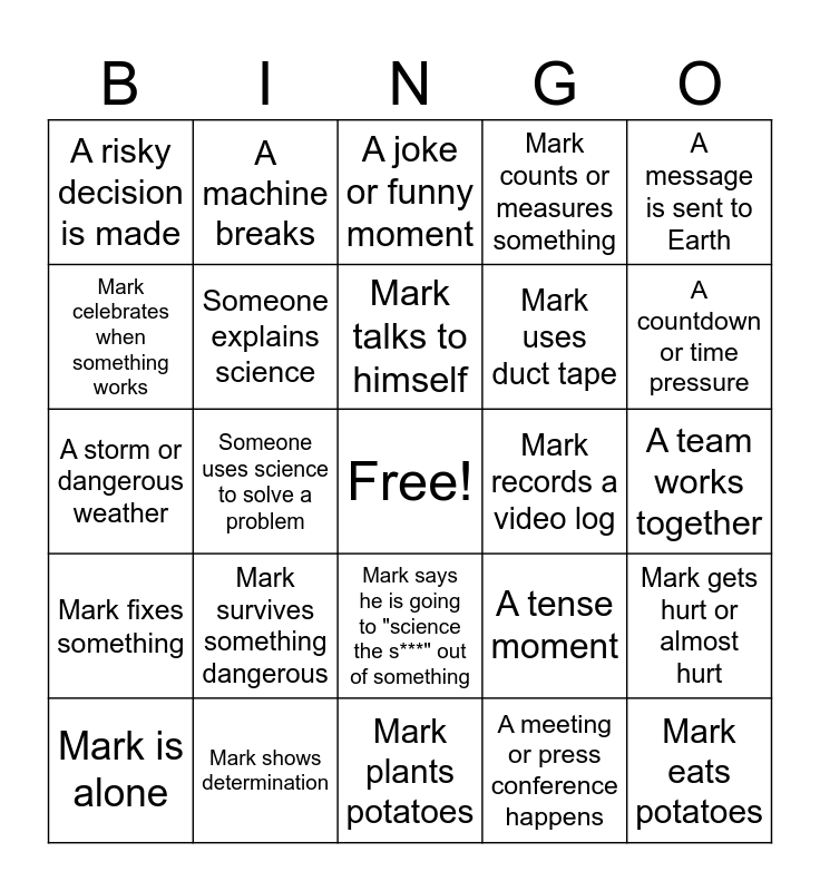 This bingo card has a free space and 33 words: A problem happens on Mars, Someone thinks Mark is dead, Someone uses science to solve a problem, Mark grows food, Mark fixes something, Someone explains science, A message is sent to Earth, Mark is alone, A machine breaks, NASA makes a plan, Mark talks to himself, A joke or funny moment, Someone celebrates, A rescue plan is discussed, Mark records a video log, A countdown or time pressure, Mark shows determination, A storm or dangerous weather, Mark survives something dangerous, A tense moment, Mark says he is going to "science the s***" out of something, Someone is worried or stressed, A risky decision is made, A team works together, Mark plants potatoes, Mark eats potatoes, Mark counts or measures something, Mark uses duct tape, Mark celebrates when something works, Mark gets hurt or almost hurt, Someone realizes Mark is alive, A meeting or press conference happens and A ship launches.