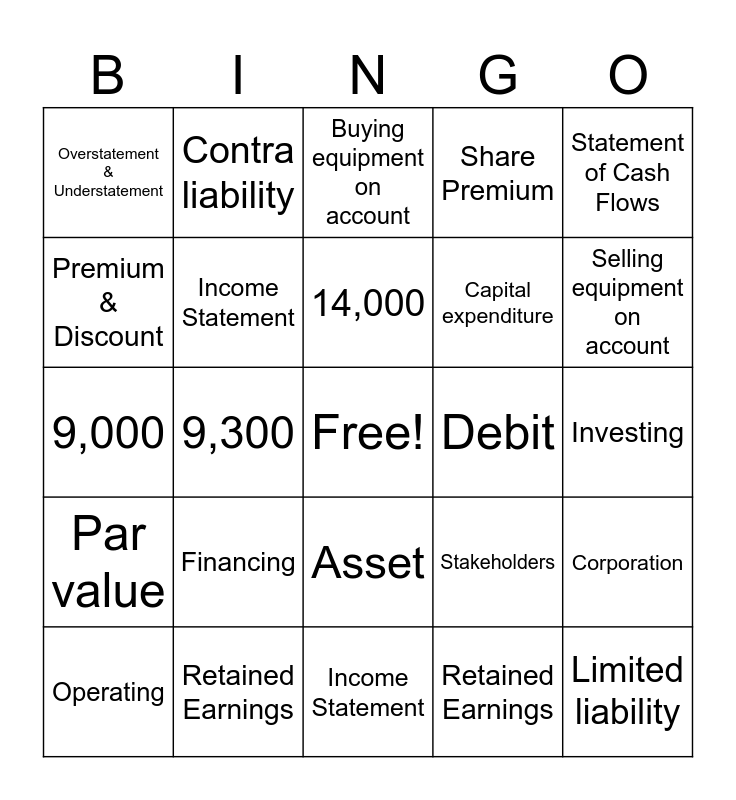 This bingo card has a free space and 25 words: Financing, Income Statement, 14,000, Operating, Statement of Cash Flows, Overstatement & Understatement, Premium & Discount, Contra liability, Debit, Asset, Capital expenditure, 9,000, Stakeholders, Corporation, Income Statement, Statement of Financial Position, Investing, Buying equipment on account, Selling equipment on account, 9,300, Limited liability, Retained Earnings, Par value, Share Premium and Retained Earnings.
