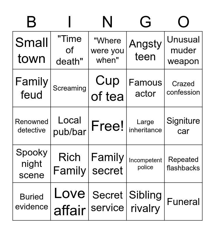 This bingo card has a free space and 24 words: Rich Family, Love affair, Cup of tea, Buried evidence, Unusual muder weapon, Small town, Family feud, "Time of death", Large inheritance, Family secret, Famous actor, Renowned detective, Incompetent police, Repeated flashbacks, Screaming, Sibling rivalry, Signiture car, "Where were you when", Crazed confession, Local pub/bar, Funeral, Spooky night scene, Angsty teen and Secret service.