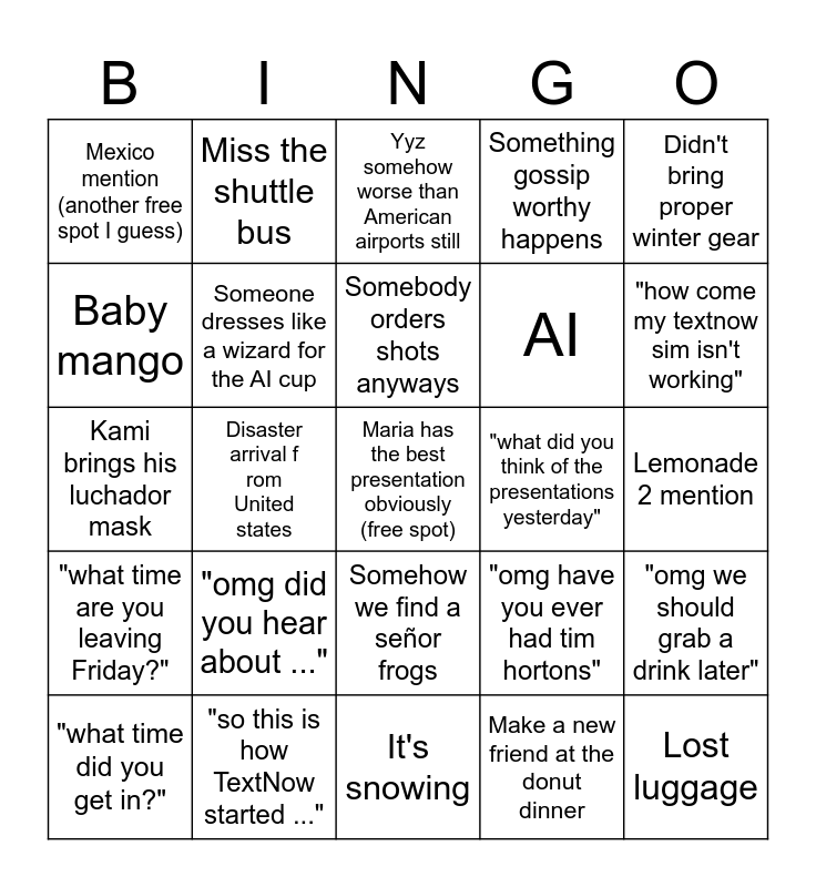 This bingo card has a free space and 24 words: "what time did you get in?", "omg did you hear about ...", Somebody orders shots anyways, Make a new friend at the donut dinner, Didn't bring proper winter gear, Mexico mention (another free spot I guess), Miss the shuttle bus, Yyz somehow worse than American airports still, "what did you think of the presentations yesterday", Lemonade 2 mention, Kami brings his luchador mask, Someone dresses like a wizard for the AI cup, "omg have you ever had tim hortons", "omg we should grab a drink later", Baby mango, "so this is how TextNow started ...", It's snowing, Something gossip worthy happens, "how come my textnow sim isn't working", "what time are you leaving Friday?", Disaster arrival from United states, Somehow we find a señor frogs, AI and Lost luggage.