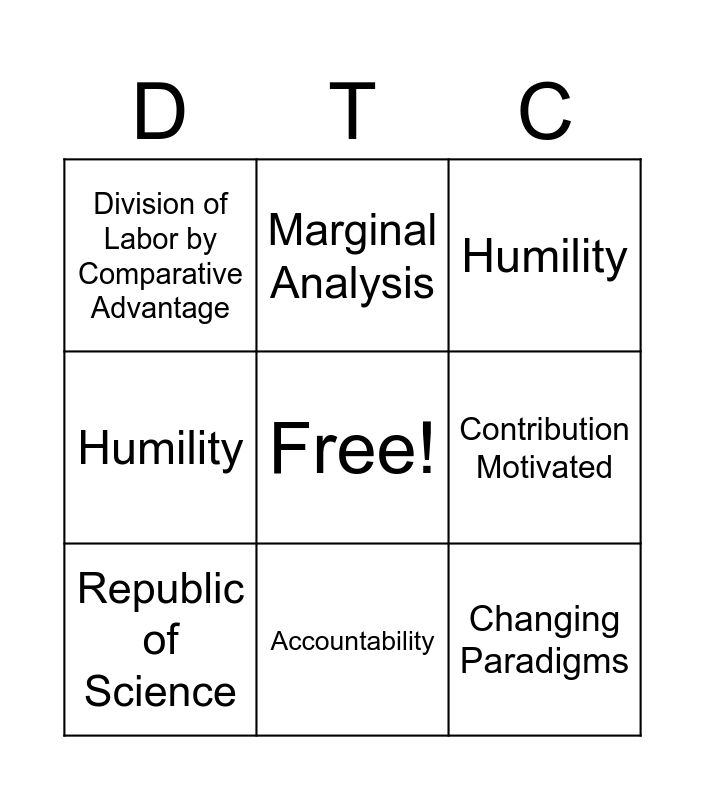 This bingo card has a free space and 64 words: Stewardship and Compliance, Property Rights, Risk, Partnerships, Our Values, Motivation, Marginal Analysis, Humility, Accountability, Alignment of Incentives, Bottom-Up vs Top-Down, Capabilities, Challenge/Scientific Method and Challenge, Changing Paradigms, Closing Gaps, Contribution Motivated, Creative Destruction, Division of Labor by Comparative Advantage, Economic Thinking, Empowerment, Experimental Discovery, Headwinds and Tailwinds, Humility, Integrity, Knowledge, Life of Meaning and Synergy, Marginal Analysis, Measures, Motivation, Mutual Benefit, Openness, Options, Our Values, Overcoming Entropy and Bureaucracy, Partnerships, Personal Knowledge, Principle-Based vs. Rule-Based, Principled Entrepreneurship, Property Rights, Republic of Science, Requirements for Human Action, Respect, Risk, Self-Actualize, Stewardship and Compliance, Talents, Time Preference and Long-Term Focus, Transformation, Virtuous Cycles of Mutual Benefit, Accountability, Capabilities, Changing Paradigms, Closing Gaps, Creative Destruction, Empowerment, Experimental Discovery, Humility, Integrity, Marginal Analysis, Measures, Mutual Benefit, Openness, Risk and Time Preference and Long-Term Focus.