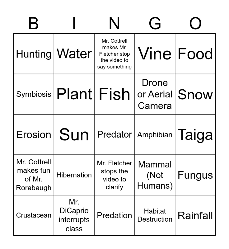 This bingo card has 50 words: Seasons, Predator, Prey, Predation, Hibernation, Migration, Water, Ocean, Symbiosis, Endangered Species, Plant, Vine, Fungus, Mammal (Not Humans), Reptile, Bird, Fish, Amphibian, Adaptation, Food, Sun, Habitat Destruction, Hunting, Drone or Aerial Camera, Climate, Rainfall, Snow, Mountain, Mr. Cottrell makes Mr. Fletcher stop the video to say something, Mr. Fletcher stops the video to clarify, Mr. Cottrell removes a student to the hallway, A student asks to leave the room and Mr. Cottrell says "Hurry up!", Fire Drill, Announcement interrupts class, Mr. DiCaprio interrupts class, Mr. Cottrell eats something, Mr. Fletcher drinks hot or cold tea, Mr. Fletcher corrects something Mr. Cottrell says, Human, Taiga, Deciduous Trees, Coniferous Trees, Scavenger, Competition, Crustacean, Erosion, It snows or rains outside, Mentions of salt or minerals, Mr. Cottrell makes fun of Mr. Rorabaugh and Thermal or night vision imagery.