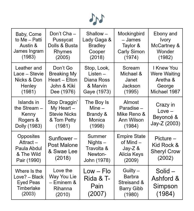 This bingo card has 35 words: I Got You Babe – Sonny & Cher (1965), Jackson – Johnny Cash & June Carter (1967), Somethin’ Stupid – Frank & Nancy Sinatra (1967), Don’t Go Breaking My Heart – Elton John & Kiki Dee (1976), Summer Nights – Travolta & Newton-John (1978), Mockingbird – James Taylor & Carly Simon (1974), Leather and Lace – Stevie Nicks & Don Henley (1981), It Takes Two – Marvin Gaye & Kim Weston (1966), Stop, Look, Listen – Diana Ross & Marvin Gaye (1973), Up Where We Belong – Joe Cocker & Jennifer Warnes (1982), Islands in the Stream – Kenny Rogers & Dolly (1983), Ebony and Ivory McCartney & Wonder (1982), Say Say Say – McCartney & Michael Jackson (1983), I’ve Had The Time of My Life – Medley & Warnes (1987), Baby, Come to Me – Patti Austin & James Ingram (1983), Almost Paradise – Mike Reno & Ann Wilson (1984), Guilty – Barbra Streisand & Barry Gibb (1980), Stop Draggin’ My Heart – Stevie Nicks & Tom Petty (1981), Opposites Attract – Paula Abdul & The Wild Pair (1990), The Boy Is Mine – Brandy & Monica (1998), Empire State of Mind – Jay-Z & Alicia Keys (2009), Where Is the Love? – Black Eyed Peas Timberlake (2003), Picture – Kid Rock & Sheryl Crow (2002), Love the Way You Lie – Eminem & Rihanna (2010), Shallow – Lady Gaga & Bradley Cooper (2018), I Knew You Were Waiting Aretha & George Michael 1987, Solid – Ashford & Simpson (1984), What Have I Done to Deserve This? – Pet Shop Boys & Dusty Springfield 87, Scream Michael & Janet Jackson (1995), Crazy in Love – Beyoncé & Jay-Z (2003), Yeah! – Usher, Lil Jon & Ludacris (2004), Low – Flo Rida & T-Pain (2007), Sunflower – Post Malone & Swae Lee (2018), Don’t Cha – Pussycat Dolls & Busta Rhymes (2005) and A Little Bit Country, a Little Bit Rock Roll Osmonds (1976).