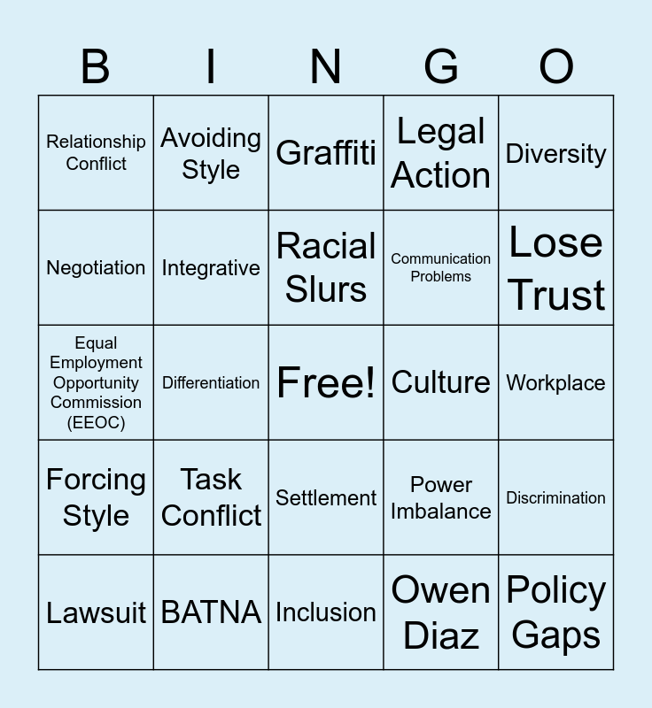 This bingo card has a free space and 24 words: Task Conflict, BATNA, Racial Slurs, Lawsuit, Diversity, Relationship Conflict, Negotiation, Avoiding Style, Culture, Settlement, Communication Problems, Equal Employment Opportunity Commission (EEOC), Power Imbalance, Discrimination, Integrative, Owen Diaz, Workplace, Graffiti, Lose Trust, Differentiation, Policy Gaps, Forcing Style, Legal Action and Inclusion.
