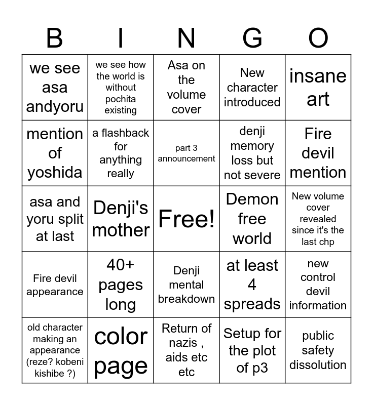 This bingo card has a free space and 24 words: 40+ pages long, color page, part 3 announcement, old character making an appearance (reze? kobeni kishibe ?), insane art, we see asa andyoru, mention of yoshida, we see how the world is without pochita existing, Demon free world, Denji mental breakdown, denji memory loss but not severe, asa and yoru split at last, at least 4 spreads, new control devil information, a flashback for anything really, Setup for the plot of p3, New volume cover revealed since it's the last chp, Asa on the volume cover, Fire devil mention, Denji's mother, public safety dissolution, Fire devil appearance, New character introduced and Return of nazis , aids etc etc.