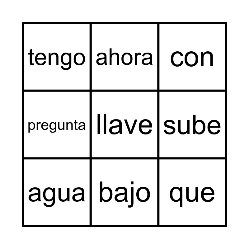 This bingo card has 32 words: una, hay, que, yo, vamos, agua, llave, sube, ahora, aqui, bajo, con, dos, dice, ella, el, flor, gusta, hay, hace, juntar, las, lleva, mejor, no, pregunta, que, sube, tengo, una, vamos and ya.