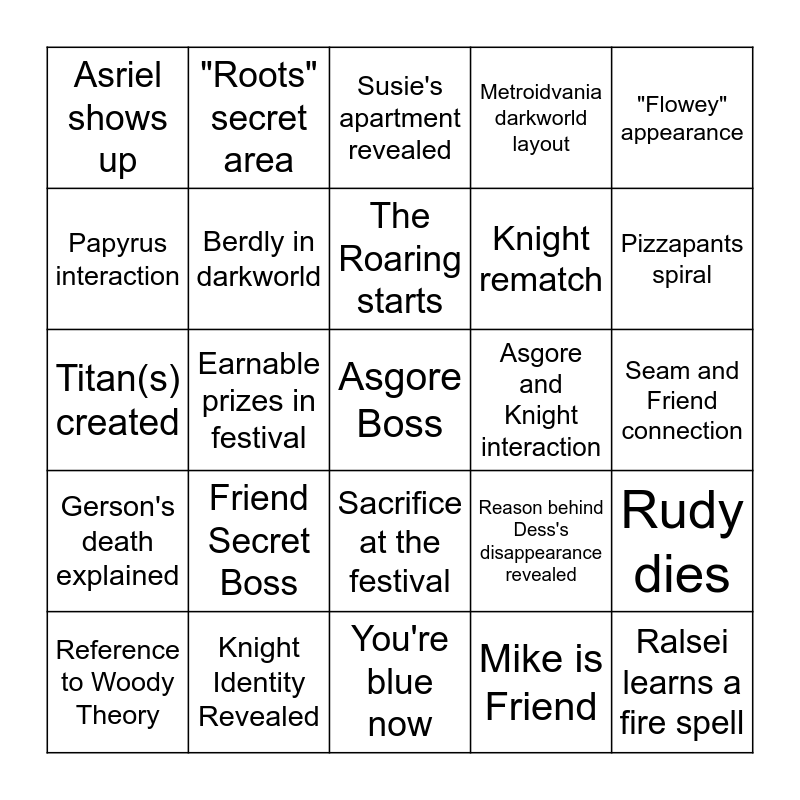 This bingo card has a free space and 24 words: Friend Secret Boss, Knight Identity Revealed, The Roaring starts, Reference to Woody Theory, "Flowey" appearance, Asriel shows up, Papyrus interaction, "Roots" secret area, Asgore and Knight interaction, Sacrifice at the festival, Knight rematch, Titan(s) created, Reason behind Dess's disappearance revealed, Rudy dies, Berdly in darkworld, Mike is Friend, Seam and Friend connection, Susie's apartment revealed, Pizzapants spiral, Earnable prizes in festival, Ralsei learns a fire spell, Gerson's death explained, Metroidvania darkworld layout and You're blue now.