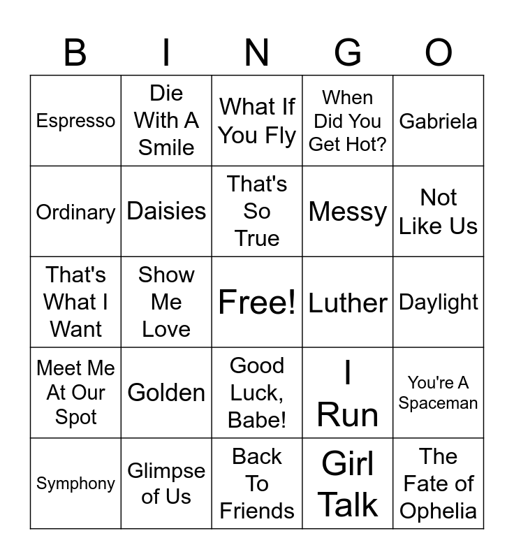 This bingo card has a free space and 50 words: Where Is My Husband, The Fate of Ophelia, Man I Need, Back To Friends, Golden, Birds of A Feather, Die With A Smile, APT., Ordinary, Care, Daisies, When Did You Get Hot?, You're A Spaceman, I Run, Opalite, Manchild, That's So True, Luther, Abracadabra, Gabriela, Show Me Love, Girl Talk, Espresso, Messy, Beautiful Things, Mirror, Not Like Us, Taste, What If You Fly, Good Luck, Babe!, Paint The Town Red, Wildflower, Golden Hour, Water, Glimpse of Us, I Will, The Boy Is Mine, Too Sweet, My Love Mine All Mine, Daylight, Heat Waves, Praise Jah In The Moonlight, As It Was, Apple, Symphony, That's What I Want, Blue Hair, Electric Love, Meet Me At Our Spot and Stay.