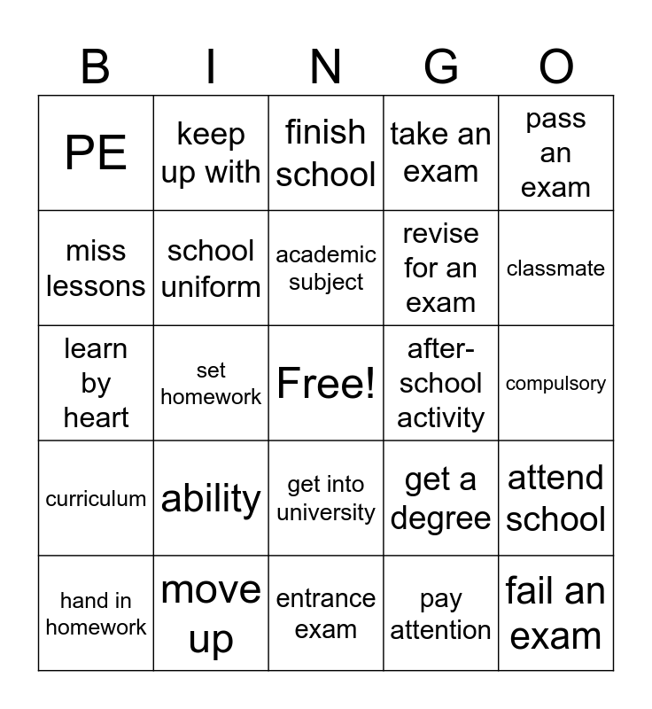 This bingo card has a free space and 24 words: ability, move up, academic subject, hand in homework, pass an exam, PE, miss lessons, keep up with, after-school activity, get into university, revise for an exam, learn by heart, get a degree, attend school, school uniform, pay attention, compulsory, finish school, classmate, set homework, fail an exam, curriculum, take an exam and entrance exam.