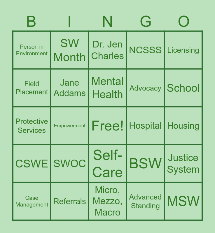 This bingo card has a free space and 25 words: CSWE, Referrals, Micro, Mezzo, Macro, Advanced Standing, Licensing, Person in Environment, SW Month, Dr. Jen Charles, Hospital, Justice System, Field Placement, Jane Addams, Code of Ethics, BSW, School, Case Management, Empowerment, Mental Health, Advocacy, Housing, Protective Services, SWOC, Self-Care, NCSSS and MSW.