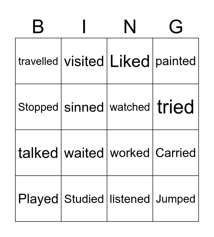 This bingo card has 20 words: Carried, Danced, Liked, Loved, Played, Stopped, Studied, travelled, talked, visited, waited, worked, sinned, Jumped, watched, Cried, tried, painted, listened and changed.