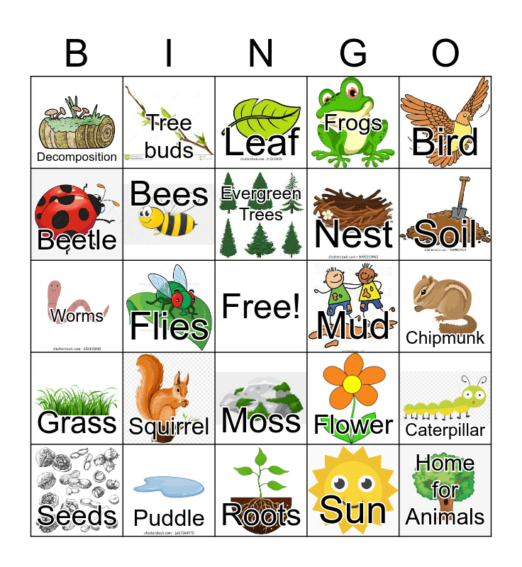 This bingo card has 24 images, a free space and 24 words: Squirrel, Puddle, Evergreen Trees, Seeds, Bird, Decomposition, Beetle, Tree buds, Mud, Moss, Nest, Worms, Flower, Caterpillar, Bees, Sun, Chipmunk, Leaf, Soil, Flies, Home for Animals, Grass, Frogs and Roots.