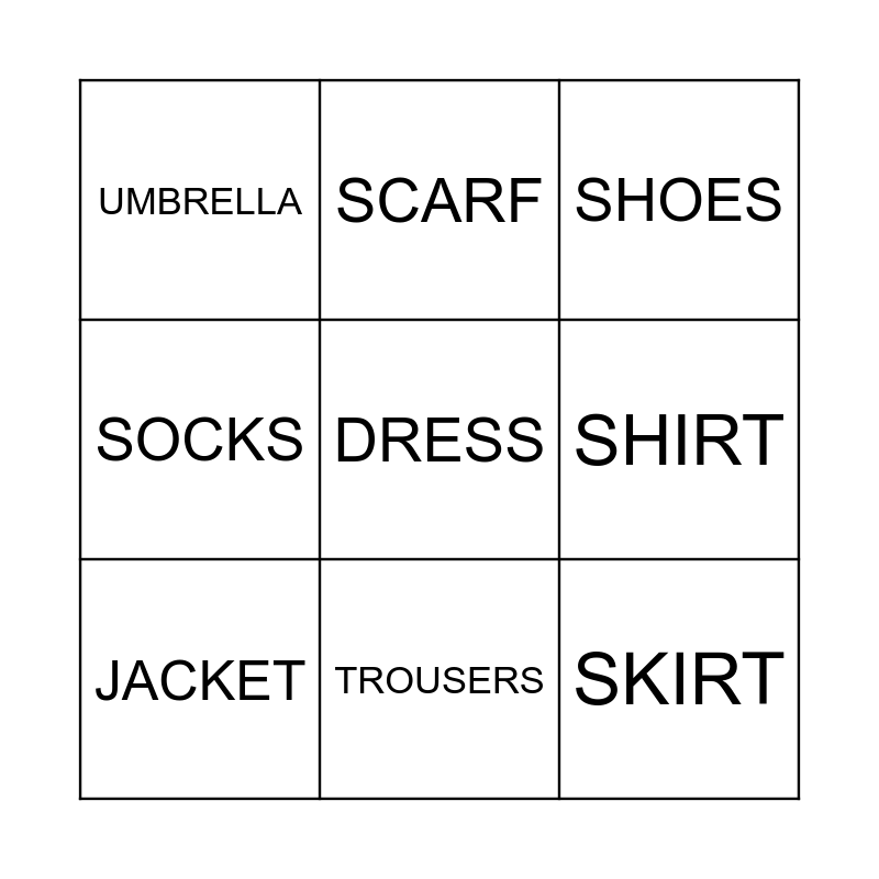 This bingo card has a free space and 11 words: T-SHIRT, TROUSERS, SKIRT, JACKET, SCARF, SHOES, SHIRT, JUMPER, SOCKS, UMBRELLA and SHORTS.