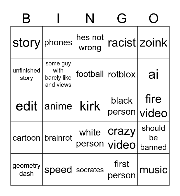 This bingo card has a free space and 24 words: brainrot, speed, football, geometry dash, zoink, story, unfinished story, phones, black person, white person, rotblox, edit, crazy video, should be banned, some guy with barely like and views, first person, fire video, hes not wrong, ai, anime, music, cartoon, racist and socrates.