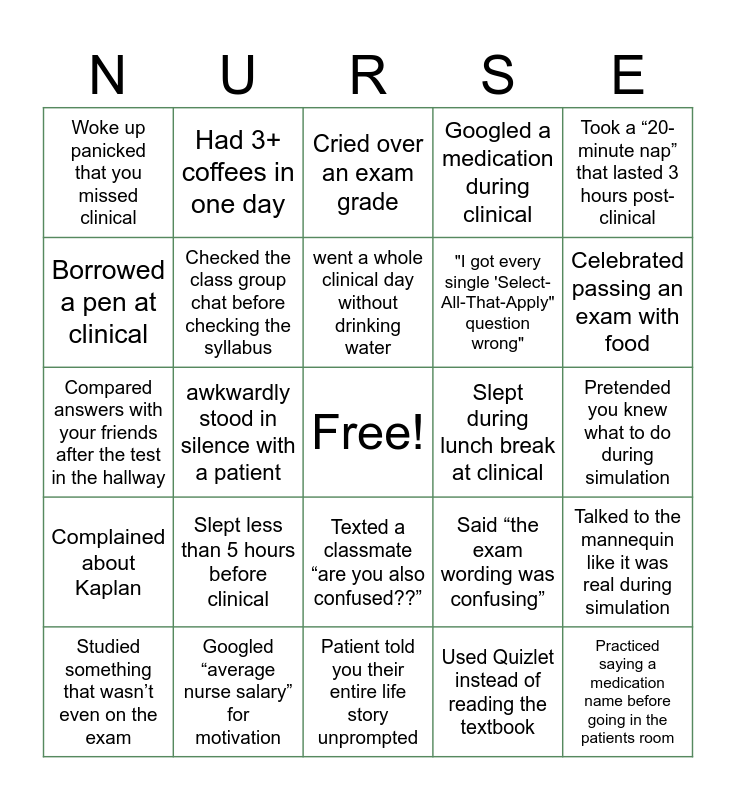 This bingo card has a free space and 24 words: Slept less than 5 hours before clinical, Googled “average nurse salary” for motivation, went a whole clinical day without drinking water, Studied something that wasn’t even on the exam, Took a “20-minute nap” that lasted 3 hours post-clinical, Woke up panicked that you missed clinical, Borrowed a pen at clinical, Had 3+ coffees in one day, Slept during lunch break at clinical, Texted a classmate “are you also confused??”, "I got every single 'Select-All-That-Apply" question wrong", Compared answers with your friends after the test in the hallway, Said “the exam wording was confusing”, Talked to the mannequin like it was real during simulation, Checked the class group chat before checking the syllabus, Used Quizlet instead of reading the textbook, Pretended you knew what to do during simulation, Cried over an exam grade, Celebrated passing an exam with food, awkwardly stood in silence with a patient, Practiced saying a medication name before going in the patients room, Complained about Kaplan, Googled a medication during clinical and Patient told you their entire life story unprompted.