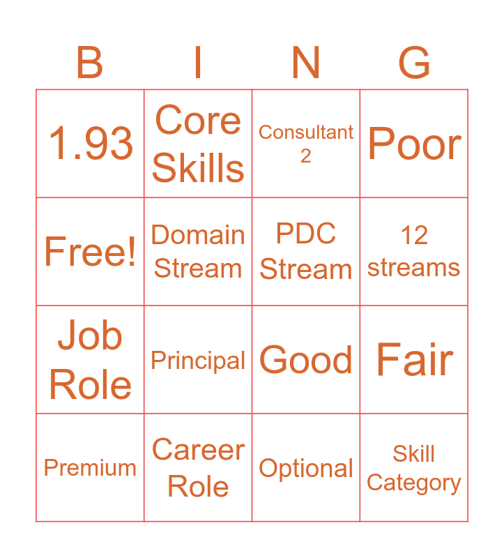 This bingo card has 16 words: Career Role, Fair, Consultant 2, 1.93, Job Role, Core Skills, Good, Optional, Free!, Domain Stream, Premium, Poor, Principal, 12 streams, PDC Stream and Skill Category.