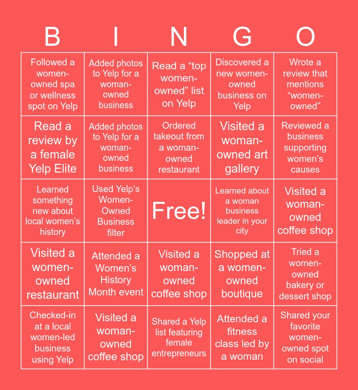 This bingo card has a free space and 44 words: Left a Yelp review for a woman-owned business, Shared your favorite women-owned spot on social, Learned about a historic female entrepreneur, Checked-in at a local women-led business using Yelp, Tagged Yelp in a Women’s History Month post, Attended a fitness class led by a woman, Read a “top women-owned” list on Yelp, Recommended a women-owned service to a friend, Wrote a review that mentions “women-owned”, Visited a woman-owned coffee shop, Discovered a new women-owned business on Yelp, Learned about a woman business leader in your city, Visited a woman-owned coffee shop, Attended a Women’s History Month event, Left a compliment for a woman business owner, Shared a Yelp list featuring female entrepreneurs, Took a selfie at a women-owned spot, Learned something new about local women’s history, Followed a woman business owner on Yelp, Reviewed a business supporting women’s causes, Added photos to Yelp for a woman-owned business, Donated to a women’s nonprofit found on Yelp, Checked-in on Yelp at a woman-owned fitness studio, Followed a women-owned spa or wellness spot on Yelp, Learned something new about local women’s history, Visited a woman-owned coffee shop, Shared a Yelp list of women-owned restaurants, Attended an event celebrating a local woman entrepreneur, Shopped at a women-owned boutique, Visited a women-owned restaurant, Checked-in on Yelp at a woman-owned fitness studio, Tried a women-owned bakery or dessert shop, Recommended a woman-owned salon on Yelp, Followed a women-owned spa or wellness spot on Yelp, Used Yelp’s Women-Owned Business filter, Tagged or mentioned a woman-owned business on social media, Shared a review that mentions “female chef”, Attended a fitness class led by a woman, Ordered takeout from a woman-owned restaurant, Read a review by a female Yelp Elite, Visited a woman-owned art gallery, Bought from a woman-owned bookstore, Added photos to Yelp for a woman-owned business and Learned something new about women’s history locally.