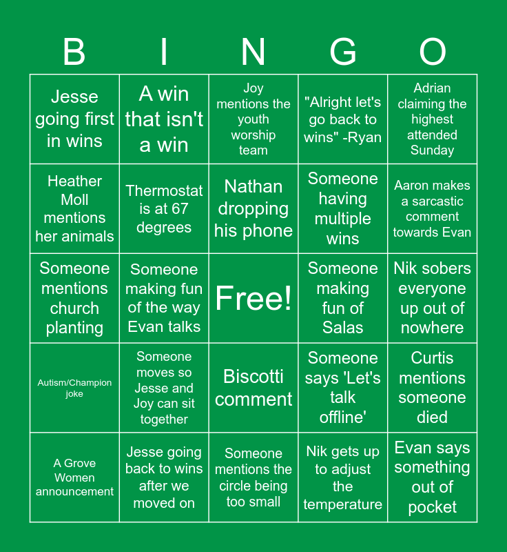 This bingo card has a free space and 24 words: Someone moves so Jesse and Joy can sit together, Jesse going back to wins after we moved on, Nathan dropping his phone, A Grove Women announcement, Adrian claiming the highest attended Sunday, Jesse going first in wins, Heather Moll mentions her animals, A win that isn't a win, Someone making fun of Salas, Biscotti comment, Someone having multiple wins, Someone mentions church planting, Someone says 'Let's talk offline', Curtis mentions someone died, Thermostat is at 67 degrees, Nik gets up to adjust the temperature, Nik sobers everyone up out of nowhere, Joy mentions the youth worship team, Aaron makes a sarcastic comment towards Evan, Someone making fun of the way Evan talks, Evan says something out of pocket, Autism/Champion joke, "Alright let's go back to wins" -Ryan and Someone mentions the circle being too small.