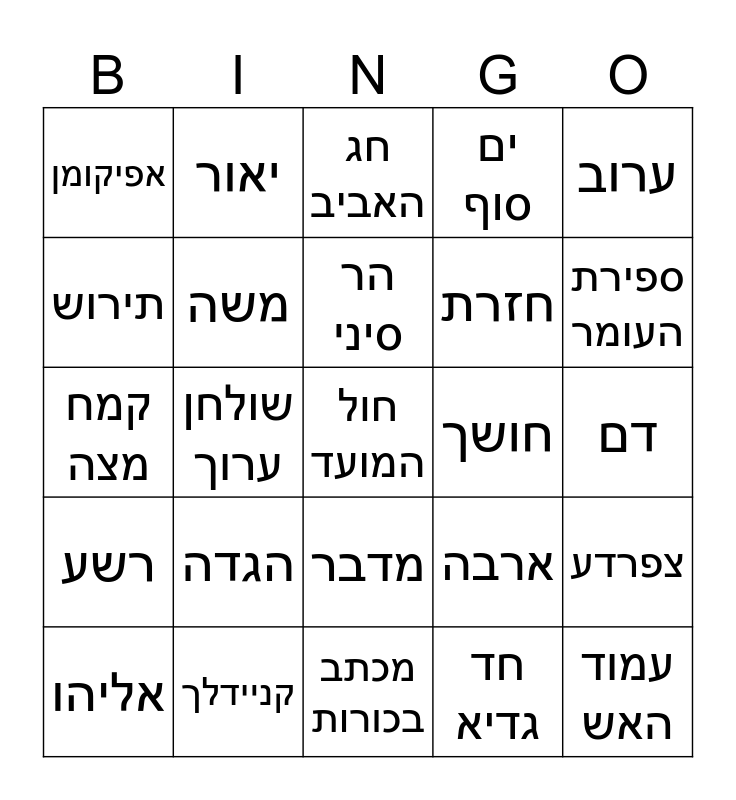 This bingo card has 65 words: חירות, ביצה, פרעה, צפרדע, אביב, אהרון, יאור, יציאת מצרים, הר סיני, עבדים, מדבר, 40 שנה, דם, ערוב, חכם, תירוש, שולחן ערוך, אפיקומן, סדר, חזרת, הגדה, רשע, ים סוף, מרור, זרוע, ברד, קערת סדר, שאינו יודע לשאול, חול המועד, מוציא מצה, אליהו, מצה, יציאת מצרים, כינים, ארבה, קניידלך, 10 הדברות, קמח מצה, חד גדיא, 4 קושיות, משה, ערוב, חושך, מרים, 4 כוסות, ניקיון פסח, ספירת העומר, חודש ניסן, עמוד האש, חרוסת, בני ישראל, דבר, שחין, מכתב בכורות, כרפס, חמץ, תם, חג האביב, קרבן פסח, ים סוף, חופש, מה נשתנה, גאולה, דמי כיס and אחד אלוהנו.