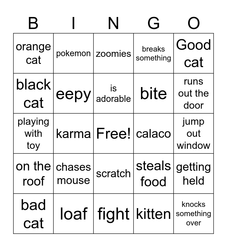 This bingo card has a free space and 24 words: chases mouse, loaf, is adorable, bad cat, Good cat, orange cat, black cat, pokemon, calaco, scratch, bite, playing with toy, steals food, getting held, eepy, kitten, jump out window, zoomies, runs out the door, karma, knocks something over, on the roof, breaks something and fight.