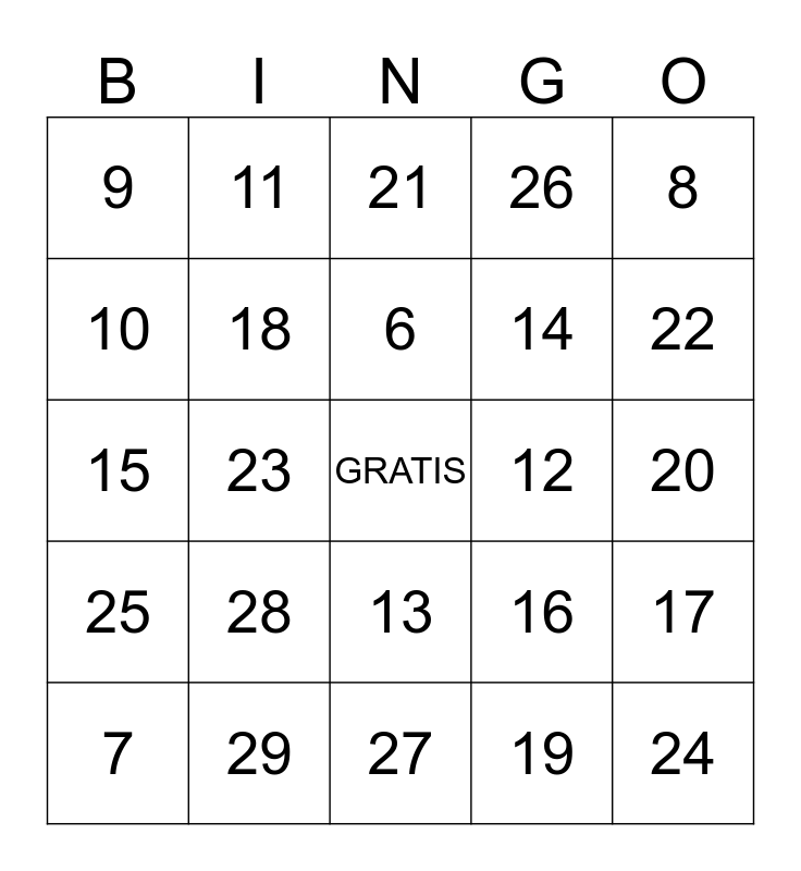 This bingo card has a free space and 24 words: 28, 29, 6, 7, 8, 9, 10, 11, 12, 13, 14, 15, 16, 17, 18, 19, 20, 21, 22, 23, 24, 25, 26 and 27.