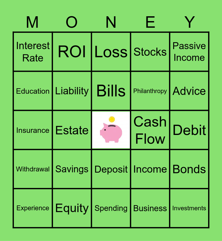 This bingo card has a free space and 48 words: Piggy Bank, Investments, Charity, Spending, Savings, Expenses, ROI, Assets, Education, Entrepreneurship, Liability, Stocks, Bonds, Income, Checking, Debt, Bills, Cash Flow, Mortgage, Passive Income, Estate, Business, Interest Rate, Philanthropy, Risks, Advice, Experience, Success, Deposit, Withdrawal, Banking, Mentor, Retirement, Emergency Fund, Equity, 401k, Credit, Debit, Budget, Financial Goal, Salary, Capital, Loss, Loan, Insurance, Financial Independence, Opportunity and Financial Responsibility.