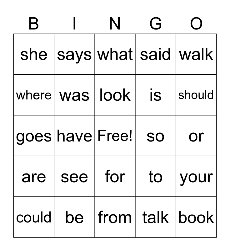 This bingo card has a free space and 24 words: see, be, look, could, walk, she, where, says, so, for, is, goes, to, your, was, talk, or, what, should, have, book, are, said and from.