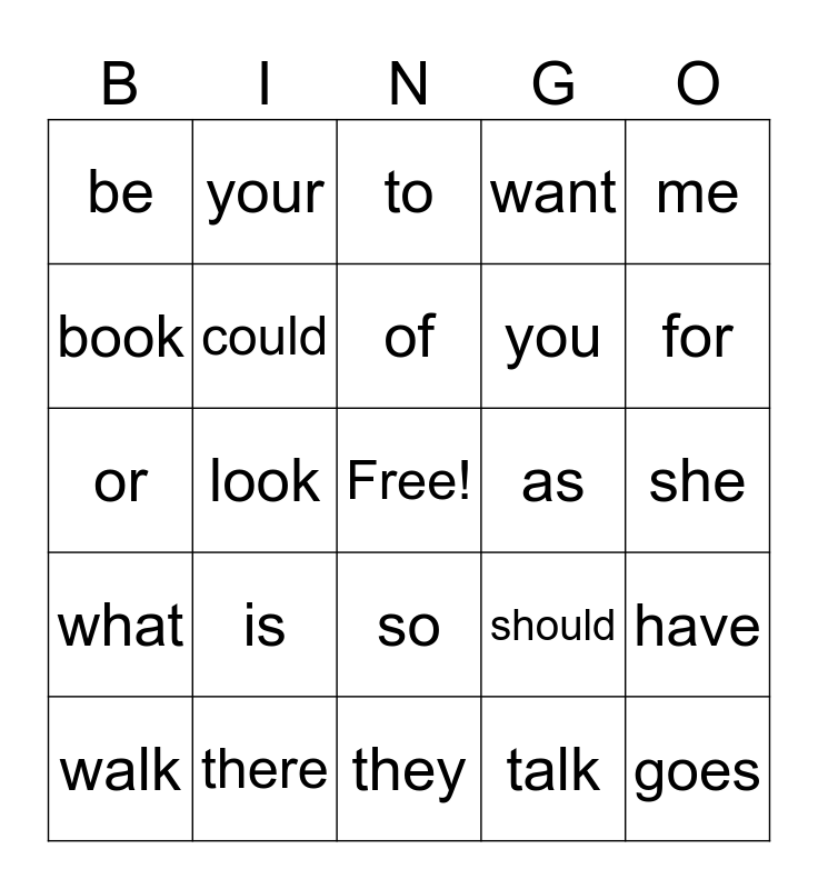 This bingo card has a free space and 24 words: is, there, of, walk, me, be, book, your, as, so, you, or, should, have, could, talk, she, to, for, look, goes, what, want and they.